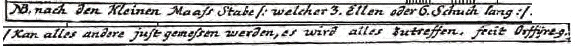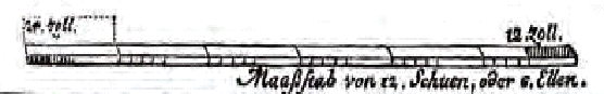 If this was a mistake by the engraver of the original copper plate it is a gigantic one and it is not one that Bessler would have likely tolerated or published. Since no correction was made or explanations given it appears to have been intentional. My conclusion was that the drawing was made with two different scales. Much like a map with an inset map. On the main map one inch might represent hundreds of miles and in the inset portion one inch may represent a hundred feet. It would be very confusing if the inset were not clearly defined as Bessler did with this drawing. As my main goal and intent is discovering "one way wheel".... first. Because Prima and Secunda drawings appear to be related the one way wheel I have focused the most on them. The measuring stick found in the lower left corner of Prima Figura has text (below) which translates : Measuring stick of twelve shoe or six ells. (SCHUEN is not a real word according to three separate sources and almost means : the act of putting on a shoe.)